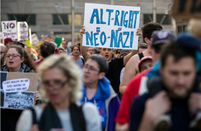 Protesters marched in Washington on Saturday, outside a conference of alt-right writers, activists and supporters. WASHINGTON — By the time Richard B. Spencer, the leading ideologue of the alt-right movement and the final speaker of the night, rose to address a gathering of his followers on Saturday, the crowd was restless. In 11 hours of speeches and panel discussions in a federal building named after Ronald Reagan a few blocks from the White House, a succession of speakers had laid out a harsh vision for the future, but had denounced violence and said that Hispanic citizens and black Americans had nothing to fear. Earlier in the day, Mr. Spencer himself had urged the group to start acting less like an underground organization and more like the establishment. But now his tone changed as he began to tell the audience of more than 200 people, mostly young men, what they had been waiting to hear. He railed against Jews and, with a smile, quoted Nazi propaganda in the original German. America, he said, belonged to white people, whom he called the “children of the sun,” a race of conquerors and creators who had been marginalized but now, in the era of President-elect Donald J. Trump, were “awakening to their own identity.” As he finished, several audience members had their arms outstretched in a Nazi salute. When Mr. Spencer, or perhaps another person standing near him at the front of the room — it was not clear who — shouted, “Heil the people! Heil victory,” the room shouted it back. These are exultant times for the alt-right movement, which was little known until this year, when it embraced Mr. Trump’s campaign and he appeared to embrace it back. He chose as his campaign chairman Stephen K. Bannon, the media executive who ran the alt-right’s most prominent platform, Breitbart News, and then named him as a senior adviser and chief strategist. Now the movement’s leaders hope to have, if not a seat at the table, at least the ear of the Trump White House. While many of its racist views are well known — that President Obama is, or may as well be, of foreign birth; that the Black Lives Matter movement is another name for black race rioters; that even the American-born children of undocumented Hispanic immigrants should be deported — the alt-right has been difficult to define. Is it a name for right-wing political provocateurs in the internet era? Or is it a political movement defined by xenophobia and a dislike for political correctness? At the conference on Saturday, Mr. Spencer, who said he had coined the term, defined the alt-right as a movement with white identity as its core idea. “We’ve crossed the Rubicon in terms of recognition,” Mr. Spencer said at the conference, which was sponsored by his organization, the National Policy Institute. And while much of the discourse at the conference was overtly racist and demeaning toward minorities, for much of the day the sentiments were expressed in ways that seemed intended to not sound too menacing. The focus was on how whites were marginalized and beleaguered. One speaker, Peter Brimelow, the founder of Vdare.com, an anti-immigration website, asked why, if Hispanics had the National Council of La Raza and Jews had the Anti-Defamation League, whites were reluctant to organize for their rights. Some speakers made an effort to distance themselves from more notorious white power organizations like the Ku Klux Klan. But as the night wore on and most reporters had gone home, the language changed. Mr. Spencer’s after-dinner speech began with a polemic against the “mainstream media,” before he briefly paused. “Perhaps we should refer to them in the original German?” he said. The audience immediately screamed back, “Lügenpresse,” reviving a Nazi-era word that means “lying press.” Mr. Spencer suggested that the news media had been critical of Mr. Trump throughout the campaign in order to protect Jewish interests. He mused about the political commentators who gave Mr. Trump little chance of winning. “One wonders if these people are people at all, or instead soulless golem,” he said, referring to a Jewish fable about the golem, a clay giant that a rabbi brings to life to protect the Jews. Mr. Trump’s election, Mr. Spencer said, was “the victory of will,” a phrase that echoed the title of the most famous Nazi-era propaganda film. But Mr. Spencer then mentioned, with a smile, Theodor Herzl, the Zionist leader who advocated a Jewish homeland in Israel, quoting his famous pronouncement, “If we will it, it is no dream.” The United States today, Mr. Spencer said, had been turned into “a sick, corrupted society.” But it was not supposed to be that way.