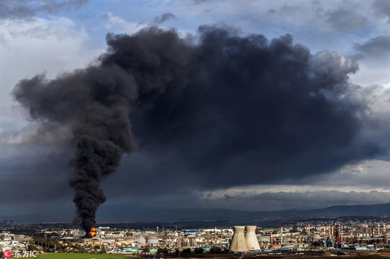 Smoke rises after a fire broke out at an oil refinery located in Haifa Bay area in northern Haifa, Israel on December 25, 2016. [Photo/IC]