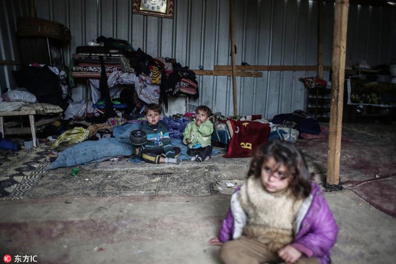 Palestinian children sit inside their family house during rainy, cold weather in a slum on the outskirts of Khan Younis refugee camp, southern Gaza Strip, on December 28, 2016.