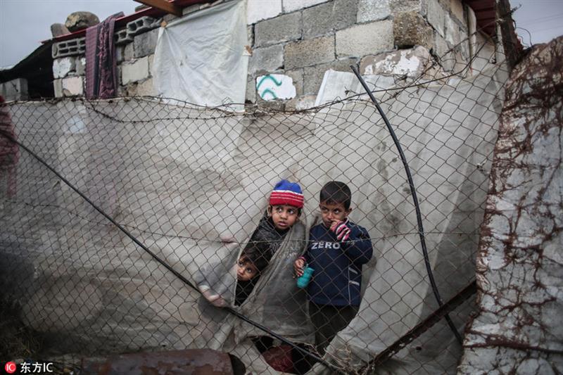 Palestinian children stand between a fence and a sheet of cloth surrounding their house during rainy, cold weather in a slum on the outskirts of Khan Younis refugee camp, southern Gaza Strip.