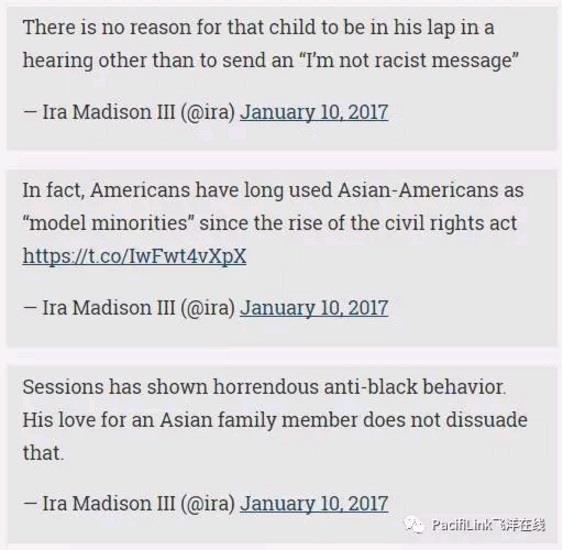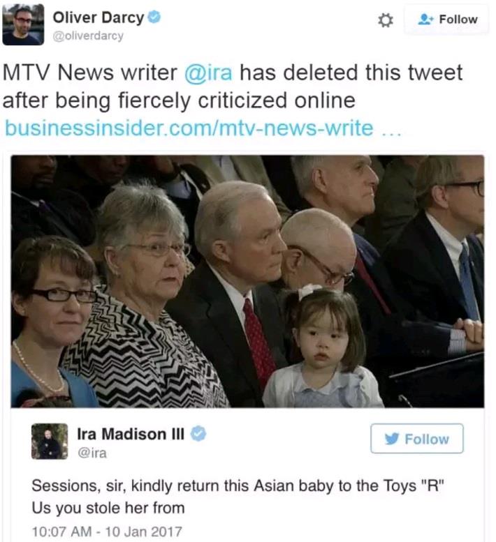 美国参议院今天举行听证会,讨论侯任总统川普提名的司法部长杰夫·塞申斯。塞申斯的几位家人也在场。期间,塞申斯的外孙女爬到祖父的腿上坐了一会儿,却被MTV的记者拿来开起了种族玩笑,而这一做法正在网上遭到各方痛批。 MTV记者Ira Madison在推特发帖说:“塞申斯先生,请把您偷来的亚裔娃娃还给玩具店。” 可是这个“偷来的亚裔娃娃”却是塞申斯的嫡亲外孙女。塞申斯夫妇是白人,他们的女儿 Ruth Sessions 嫁给了一位亚裔 John Walk。