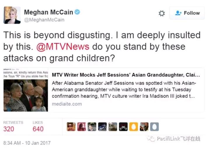 Madison虽然删了原帖,可是不但没有道歉,而且继续发帖为自己辩解:“塞申斯让那个孩子坐在自己腿上没有任何原因,无非是想告诉别人他不是种族份子” Miss CJ在自己的博客中发问,“没有任何原因?真的吗?你想向不出一个小孩子为什么想坐在爷爷的腿上?这对你来说只能是政治作秀?” CJ还一针见血指出一个拥护多元化,提倡包容,讲究大爱的左媒记者为什么会发飙:显然,一个有亚裔血统的孩子,居然是白人参议员的外孙女,这怎么可能?一个共和党竟敢有个亚裔外孙!他的家庭居然这么多元化??? 塞申斯在移民问题上立场强硬,尤其是反对非法移民的态度非常坚决,因此左派媒体长期以来一直抨击他为种族份子,认为他排外。但是他的女婿是亚裔这件事鲜有报道。MTV的记者发帖前或许真的不知道那个小女孩是塞申斯的亲孙女。也正是由于塞申斯的"种族份子"大帽,这个所谓的“玩笑”才如此轰动,而他的后续发帖更是是持续发酵。