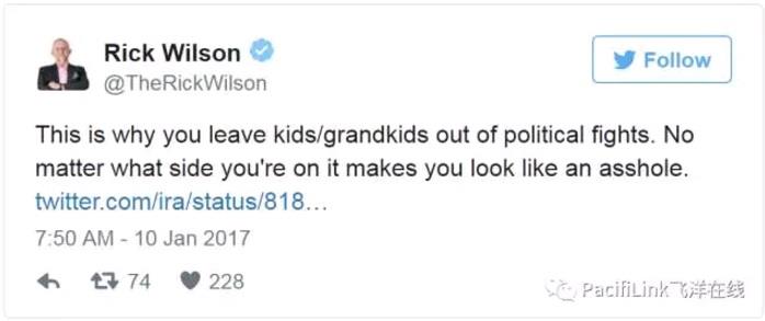 Rick Wilson则更加直接:“这就是为什么你永远不要在政治斗争中牵扯对方的子女。不论你在哪一方,(攻击孩子)会让你表现得像个混蛋”