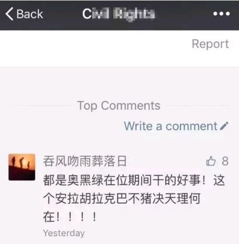 图:MITBBS川粉种族主义言论举例 另一个较有名的中文论坛HUAREN,当然也不能幸免于这场声势浩大的政治运动。与男性网友为主的MITBBS不同,HUAREN的网友绝大多数为女性。与MITBBS的特色脏话相呼应,HUAREN的一大景观是一小部分女网友长年各种炫耀并侮辱华人男性。此论坛大选期间,支持川普的帖子占据主流,反对川普的网友经常被用女性特有的语言风格进行尖酸刻薄的挖苦。一些网友不堪语言暴力,自建微信群抱团取暖,表示不再上HUAREN论坛。除了HUAREN和MITBBS以外,其他若干中文论坛,包括“倍可亲”,“文学城”和“知乎”,也聚集了大量川粉,个别挺川组织的头面人物,甚至也到此类论坛发帖。 由于“沉默”的大多数不分场合不分昼夜的宣传,各种中文网络媒介的面貌完全变了一个样子。当我上厕所时拿着手机随便打开一个讨论与政治无关的生活杂事的微信群,爬了五分钟的楼发现全是川粉的鸡血口号的时候,真是忍不住感叹:如今是川粉的世界啊,你看,连屙尿都碰上了川粉! 打倒左X圣母,一切荣耀归川普 华人挺川运动的气氛,充斥着对现实的高度不满,认为美国社会江河日下,民不聊生,自己也受到了莫大的冤屈。这些论调,当然有些符合事实,有些不符合。但有趣的是,一切不满的原因,都被华人川粉归到以奥巴马为代表的民主党或左派身上,并给他们起了个名字叫“左X”。至于一切不满的解决方案,则被归于共和党,或更确切的说,是川普和他的团队,因为一切批评或质疑川普的共和党政客都也被列为坏人,被称为“建制派”或“假共和党”。为了表示对民主党的深恶痛绝,一些人故意将这三个字打成“民猪党”。奥巴马作为过去八年的民主党总统,更是众矢之的,在MITBBS上被一些川粉称为“奥黑驴”,他夫人米歇尔也被起了个充满种族歧视意味的外号“母猩猩”。