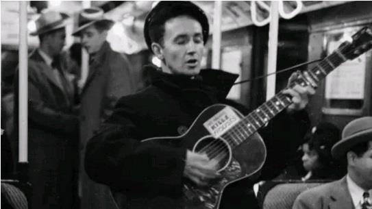 Woody Guthrie在纽约城的地铁上唱歌