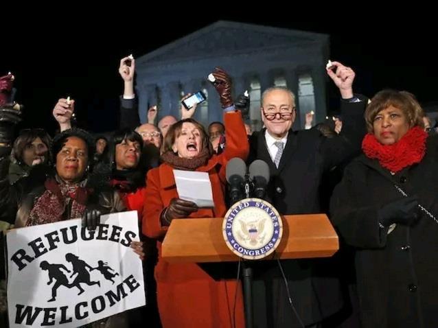 在“穆斯林7国旅行禁令”刚发布时,民主党少数派领导人Nancy Pelosi在高院发表抗议演说时话筒出了故障,她随即和身旁的人一起唱起了这首《这片国土是你们的土地》。当时还被川普在推特上笑话了”假眼泪和坏掉的话筒——乱糟糟的场景像极了现在的民主党“。