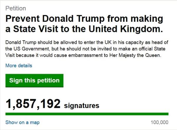 之前闹得沸沸扬扬的英国人签字反特朗普来访有了结果,最终,185万人签字。 然而,并没有什么X用…… 特朗普上任后下令暂时禁止穆斯林居多的7个国家公民入境,引发强烈批评。