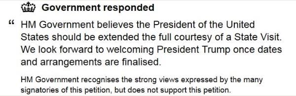 线上请愿书已获得185万余人签名 针对这项请愿,英国政府14日回应,尽管理解民众的意见,但不支持这次请愿。 政府认为,特朗普到英国进行国事访问期间,应该受到“全面礼遇”,而这次的访问表明了英美两国之间的友谊,一旦日期与相关安排敲定,很欢迎特朗普到访。