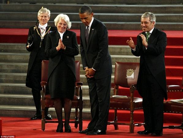 2011年5月25日,美国前总统奥巴马和约翰·伯考(右)在英国议会 曾任外交及国协事务部高层官员的芮基兹(Lord Ricketts)先前表示,梅邀请特朗普很让他“惊讶”,不明白特朗普为何“特别应该”这么快就见到女王,应该先看看特朗普是怎样的总统,再决定是否建议女王邀请特朗普国事访问,这样比较明智,“现在女王的处境很难堪。” 芮基兹建议,国事访问应该推迟,改为邀请特朗普进行官方访问,“主要和首相(梅)对谈”。 特朗普前任的美国总统欧巴马,在首次任期,直到就职2年6个月后才到英国首次国事访问。