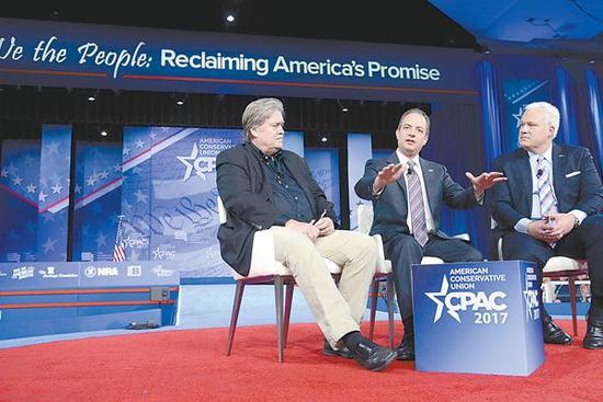 23日,美国白宫幕僚长普里伯斯(中)、白宫首席战略顾问班农(左)和美国保守党联盟主席 施拉普(右)在一年一度的保守派政治行动大会上发表演讲。 一年一度的美国保守派政治行动会议本周三到周六在马里兰州召开,特朗普政府内阁要员悉数到场。白宫首席战略顾问班农、白宫幕僚长普里伯斯、副总统彭斯、总统顾问康威、司法部长塞申斯、教育部长德沃斯等多名官员先后参加访谈和上台演讲,积极维护特朗普政府的相关争议政策。 随着特朗普入主白宫,共和党人十年来首次同时控制了白宫和国会,因此今年的保守派政治行动会议格外引人注目。与会者超过1万人,除了共和党官员,还有美国企业研究所等保守派智库以及美国步枪协会等保守派组织。 作为特朗普政府最有影响力的人物之一,白宫首席战略顾问班农在23日罕见露面,阐述了特朗普政府优先的核心议程。美国媒体总结称,班农将特朗普政府的优先事项分为三个方面:国家安全与主权、经济民族主义、解构行政国家。 美国媒体整体偏向自由派成为包括班农在内很多嘉宾抨击的焦点。班农把美国媒体称为“反对党”,称它们在很多问题上一错再错。据“美国之音”报道,班农说,“如果你们认为,不与媒体斗争就能把你们的国家从媒体手中夺回来,那就大错特错了”。 在贸易等问题上,班农发出强硬信号,提出“经济民族主义”,称退出TPP是美国现代历史上的重要时刻,是美国在贸易协定上行使自主权利的象征,也是美国重新设计贸易政策的第一步。 班农还为特朗普的内政外交进行辩护,认为特朗普的政治行动是一次将摧毁并重塑美国现行体制的运动,特朗普任命非传统政治人物担任内阁关键职务,目的就是打破美国过多的监管。 美国媒体此前报道称,由于成长背景截然不同,共和党内建制派的“宠儿”普里伯斯与商人及右翼网站经营者班农存在矛盾。但是在23日的访谈上,班农和普里伯斯并排而坐,谈笑风生,似乎是有意打消媒体的猜测。班农和普里伯斯还描述了两人的工作状态,互相称赞,普里伯斯称班农对特朗普“特别忠诚”,观点一致,班农则说普里伯斯“有决心”“表现稳定”。两人甚至表示从早上6点半到晚上11点的多数时间都在一起,以示团结。 23日晚,副总统彭斯发表演讲,再次表达推翻奥巴马医保的决心。彭斯称特朗普政府是一个“兑现承诺的政府”,特朗普已经在兑现他在竞选期间对美国人民所作的承诺。彭斯以竞选演说般的激情说,特朗普是一个有“信念、愿景和勇气”的人。彭斯还表示,媒体和民主党仍在试图对特朗普和保守派的行动视而不见。但是他说,现在正是到了证明保守派给美国提供答案的时候,那就是更多的就业、更少的税收、一支强有力的军队以及对宪法的尊重。 24日上午,特朗普发表演讲,再次炮轰媒体。他抨击美国媒体人不诚实,采用错误和虚假的消息源,是民众的敌人,而民众没有成为新闻报道的主角。他重申将美国民众放在第一位,要求公平贸易,承诺修建美墨边界隔离墙。特朗普是继里根之后又一位参加保守派政治行动会议的在职总统。白宫官员此前在通报这一消息时将特朗普同里根相比,称两人在加强国家安全以及推动保守派议程上都有建树。
