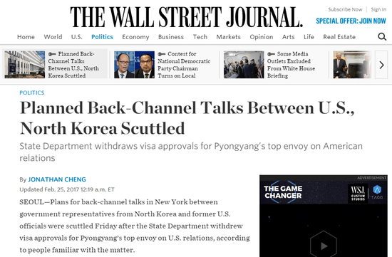 路透社25日引述美国《华尔街日报》的报道称,美国国务院拒绝核发签证给朝鲜高级官员后,朝鲜和美国自特朗普就任总统以来的首次接触计划已经取消。 《华尔街日报》称,朝鲜外务省高级官员崔善熙(Choe Son Hui)和前美国官员间的会谈,原本预计3月1日、2日在纽约举行,但崔善熙拿不到签证后,会谈已经取消。 路透社说,目前尚不清楚美国务院为何拒发签证给崔善熙,不过朝鲜2月12日发射弹道导弹以及金正男案,都可能扮演“相当程度的角色”。 但是一名美国国务院官员否认了所谓“双轨”讨论已排定。“美国政府没有计划在纽约举行会谈,”这位官员说,并拒绝评论签证事件。 报道还称,韩国外交部官员拒绝评论纽约会谈取消的报道,称报道中的会谈不涉及美国和韩国政府。美国驻韩大使馆也未发表评论。