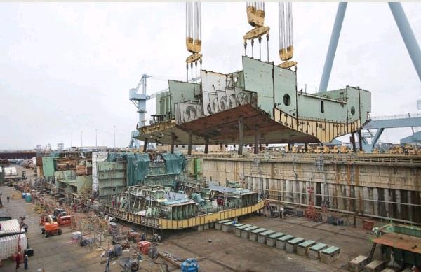 由于现代战舰多使用模块化的分段建造法,已经没有了传统意义上的铺设龙骨一说,也有船只会在开工仪式上象征性的铺设“龙骨”。模块化分段建造优点是速度快,很多内部设施和装备可以提前搭建,只需要组装焊接即可,但另一方面由于分段多是数个工厂分别建造,对工期和质量要求更高。