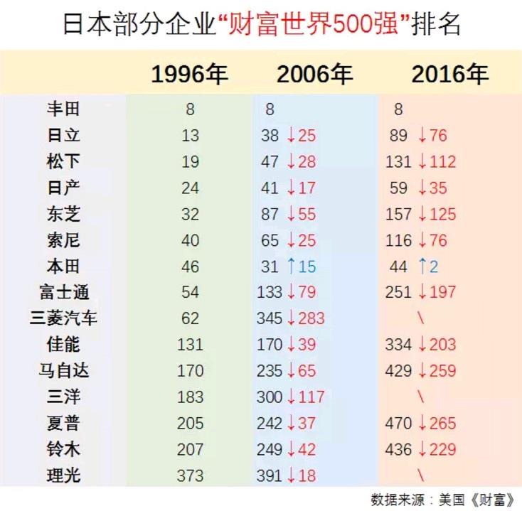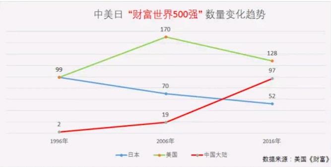 1996年,日本上榜企业多达99家,与美国并驾齐驱;2006年,减少至70家;2016年,仅剩52家,比20年前,锐减了近一半。