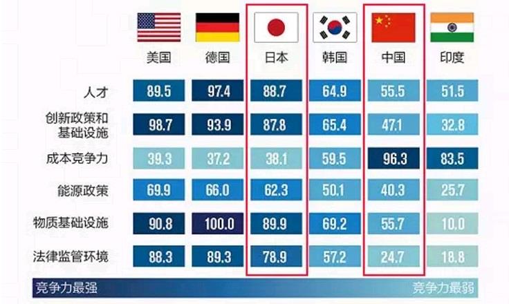 事实上,中国制造业的国际竞争力,很大程度上归功于人工和材料成本方面的优势。在人才、创新政策、基础设施等方面,中国与日本,差距仍然很大。