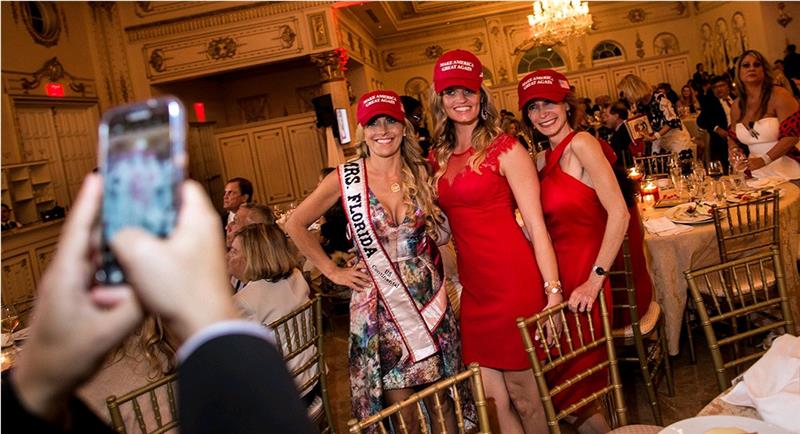 Mrs. Florida, Karyn Turk of Wellington, poses with fellow Trump supporters during the annual Republican Party of Palm Beach County's Lincoln Day Dinner on March 24 at Mar-a-Lago Club in West Palm Beach, Florida. | M. Scott Mahaskey/POLITICO PALM BEACH, Fla. – President Donald Trump doesn't need to be at Mar-a-Lago for his glitzy private club to feel like the winter White House. The reminders are pretty much everywhere. Stacked high at the front desk, just through the wrought-iron door at the main entrance, are copies of the latest issue of the seaside resort’s glossy promotional magazine, complete with a two-page photo spread celebrating the club owner’s biggest triumph yet. "Road to Victory,” reads the article’s headline. “Eric Trump walks us through some of the memorable moments on his father’s path to the White House." On most weekends since Trump’s inauguration, the president and his entourage have been spotted in the club, loading up plates at the breakfast buffet, mingling with dues-paying members, turning up in photos on guests’ Facebook and Instagram feeds. Melania Trump’s turn came Friday night. The seldom-seen first lady and her son Barron are there for spring break, and she made a brief cameo to greet a cocktail reception hosted by the county Republican party. More than 700 Republican power brokers, fundraisers and foot soldiers paid $300 for a seat or as much as $5,000 for a table to enter the latest gala of the season inside the gold-painted Donald J. Trump Ballroom. Attendees said it was the most overtly political shindig at Mar-a-Lago since its host moved into the White House.