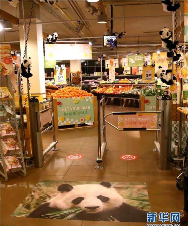 4月5日,在荷兰中部小城雷嫩,一家超市的入口处装饰着熊猫照片和熊猫玩偶。