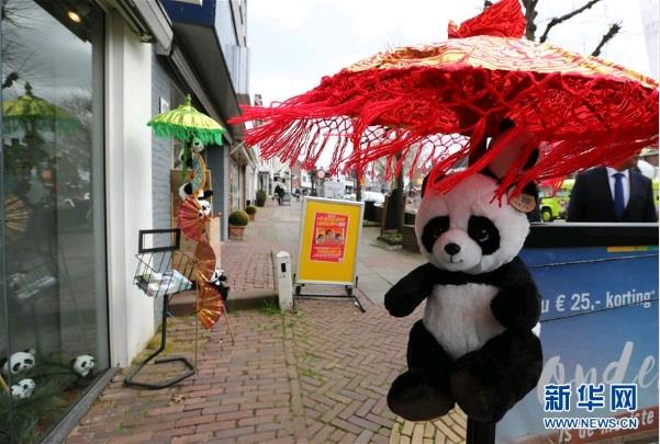 4月5日,在荷兰中部小城雷嫩,一家商店门口摆放着用于装饰的熊猫玩偶。