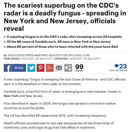 美国疾病控制和预防中心CDC昨日发出警告:一种新型的丶罕见的“超级病菌”正在扫荡美国东海岸,该病菌是目前最致命的细菌,发病地区集中在纽约以及新泽西地区。 这种真菌被命名为“耳道假丝酵母菌”(Candida auris),耳道假丝酵母菌可造成严重丶甚至致命的真菌感染,CDC将这种病菌定义为最可怕的最致命的超级细菌(The Scariest and deadlist superbug)。