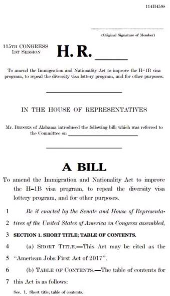 到4月底,为了响应川普对于H1B改革的号召,美国2位议员正式向国会提交了新的H1B改革议案。目前,议案尚处于提案阶段,如果国会众议院投票通过,就意味着川普行的政令有了具体的执行议案。 对于留学生而言,这份新出的议案对我们是有利还是有弊呢?不妨让我们仔细看看议案的具体条款。 根据美国议员网站(brooks.house.gov)上的信息,这份提案简称为“American Jobs First Act of 2017”。