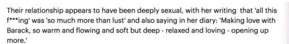 彼时的奥巴马还只是哥伦比亚大学的一名新生,同时在一家专门准备金融报告的公司兼职。 吉内威芙出生于澳大利亚,两人谈恋爱之前,她跟妈妈和继父一起住在帕克大街的公寓里,不过因为她的亲生父亲是一位间谍同时又是一位外交官,所以她也经常跟随父母满世界乱跑。还曾在印度尼西亚住过一段时间,这一点跟奥巴马很像。 吉内威芙在自己的日记中记录了当时跟奥巴马见面时的场景,“我太投入了,我们一直在不停地聊天。”“冥冥之中,有什么东西将我们联系起来,可能是因为我们都不知道自己从何而来,都没什么归属感。” 当然他们的第一次约会肯定不止于聊天,他们在奥巴马跟另外两位室友合租的公寓里度过了美好的一晚,奥巴马为吉内威芙下厨,之后两人就在卧室里畅谈,然后吉内威芙就留下来过夜了,“一切就自然而然地发生了。” 几天后两人又一起过夜,吉内威芙对奥巴马在床上的表现评价极高,她甚至还为此写了一首诗。诗中写道,“B,这首诗献给你,献给我们曾经一起做过的爱。” 传记里还披露了吉内威芙对两人性角色的描写,“虽然他在性生活方面并不浪漫,但他却可以让人觉得很舒服,他绝对不是那种胆小的人,你绝不会听到他说‘我不行’,‘这太大胆了’‘我不敢’这一类的话,总而言之,他就是那种让人觉得很踏实的人。” 显然,他俩的关系中,性占有很大一部分。吉内威芙在她的日记中写道,“‘我们做爱远不止于满足肉欲’,‘跟巴拉克上床让我感到温暖,舒服,一切都十分温柔又深入灵魂’‘我们在一起时,可以让彼此感到前所未有的放松与爱恋,还有许多不可言喻的感情。’”