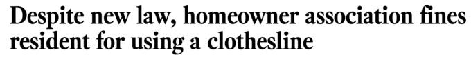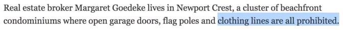想住?你就必须得签字。 小区哪都不给你晾, 就算闹上法庭, 一位姓李的中国妈妈 结果挨了200多刀的罚款, 不只是小区, 看到《纽约时报》上说, 就是因为一条“晒衣绳禁令”: