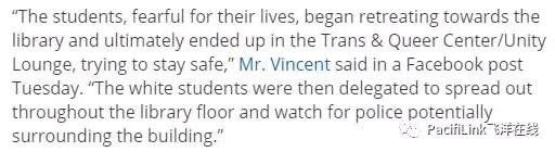 这是早先的报道,后来又有左媒整出另一个版本,说学生放过了教授,走出教学楼就迎面碰到警察,学生们担心自己有"生命危险",于是撤到图书馆,堵住门,躲在里面。飞洋在线的读者中绝大部分不相信主流媒体,所以我们也不必过多解释了,还是省点时间继续讲故事。顺便说一句,学生占领的是图书馆的Trans & Queer Center(变性人和同性恋中心)。把图书馆的大厅正式命名为"变性人和同性恋中心"倒也符合左派学校的作风。
