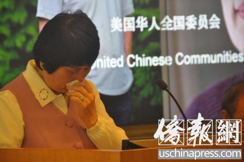 2015年9月15日,美国华人全国委员会就华裔教授郗小星、华裔专家陈霞芬被错控的案件召开新闻发布会;陈霞芬说到自己被错控的经历时几次潸然泪下。(《侨报》记者徐一凡摄)