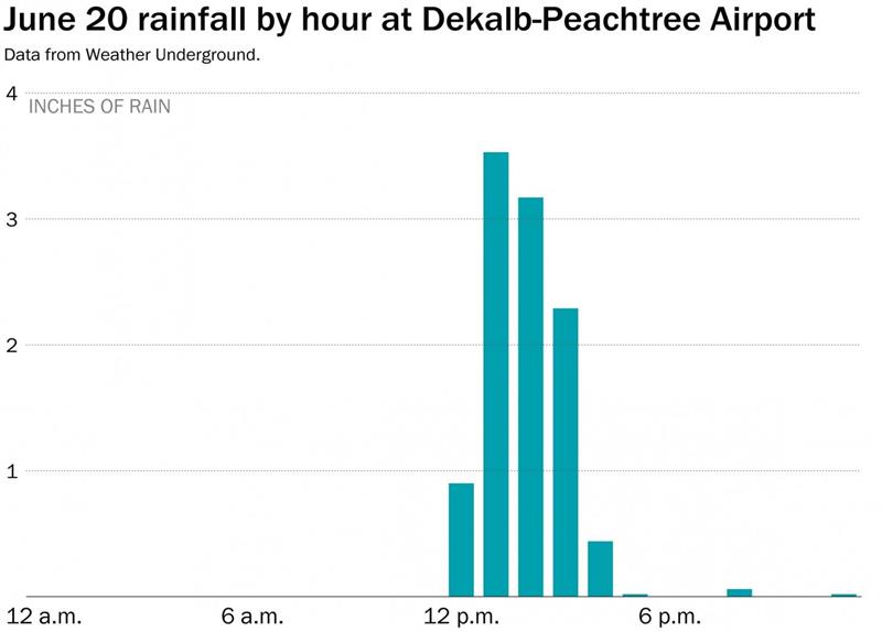 At Dekalb-Peachtree Airport, southeast of the district, rainfall totals spiked in the midafternoon as a thunderstorm passed overhead.