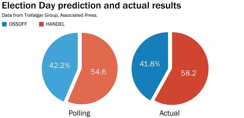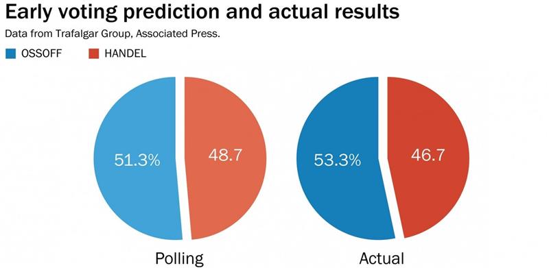 With that lead among voters who cast ballots before the rainy Election Day, it would suggest that Republican Karen Handel would need to do better on Election Day itself. Trafalgar figured she would, by a 12-point margin, enough to give her a not-huge-but-comfortable victory. Trafalgar figured Ossoff would get about 42 percent of the vote that day, with 3 percent of voters still undecided. Handel overperformed that estimate, earning a 16.4-point victory in Tuesday’s vote. The victory Trafalgar predicted was more comfortable than expected.