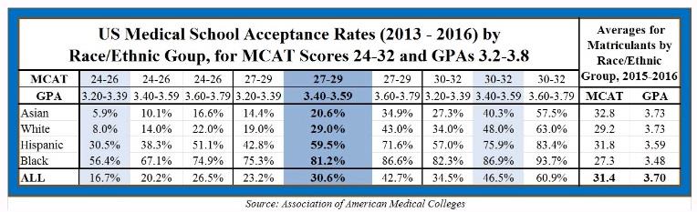 The bar chart above is based on selected data from the table below the chart and shows the acceptance rates for US medical schools based on three different combinations of MCAT scores and GPA by ethnic/race group during the 2013-2016 period. As I explained in previous CD post that featured the table above (but not the new bar chart, which was just prepared with assistance from Olivier Ballou): For the 2015-2016 academic year, the average GPA of all students applying to medical schools was 3.55 and the average MCAT score was 28.3 according to data from the Association of American Medical Colleges (AAMC). The highlighted dark blue column in the middle of the table above displays the acceptance rates to US medical schools for applicants from four racial/ethnic groups for applicants with: a) GPAs that fall in the 3.40 to 3.59 range that includes the average GPA of 3.55 and b) MCAT scores in the range between 27 to 29 that includes the average MCAT score of 28.3. Acceptance rates for students with slightly higher and slightly lower than average GPAs and test scores are displayed in the other columns. In other words, the table above displays acceptance rates by race/ethnicity for students applying to US medical schools with average academic credentials, and just slightly above and slightly below average academic credentials.