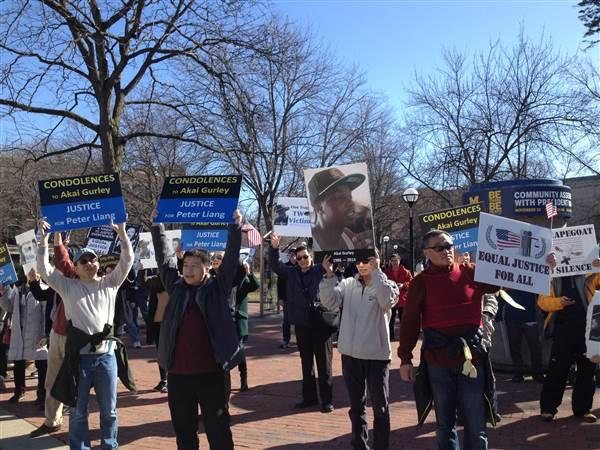 The rally, inside Cadman Plaza Park not far from where Liang's trial took place, was one of more than 30 planned in cities throughout the country Saturday, including Ann Arbor, Los Angeles, San Francisco, Chicago, Philadelphia, and Boston. The rally in New York began a little before noon with a moment of silence for 28-year-old Akai Gurley, who was killed by a ricocheting bullet fired from Liang's gun in November 2014.