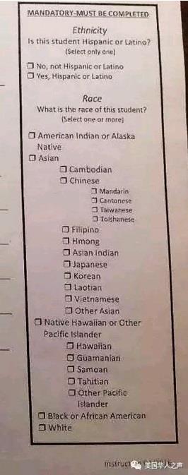 In a nutshell, the sole purpose of Asian disaggregation is to subdivide the tiny Asian population, 5.6% of the total American population, into many even smaller subgroups by ethnic origin. Asian disaggregation has no mention whether or not the Asian community is more diverse than the rest of the remaining 94.4% population. In implementation, one simple example is that under California AB1726 Asian students in California are required to self-identify their ethnic origin by filling out the form similar as below.