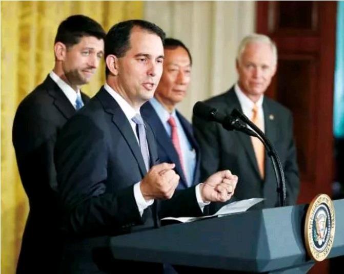 ▲威斯康辛州州长斯科特·沃克周三在白宫举行的富士康威州投资新闻发布会上。均据美联社 收购夏普、投资美国,富士康布局全球市场份额 据报道,富士康计划在威州设立10.5代线大型面板工厂,以生产大屏幕电视的显示屏,预计2020年投产。为吸引富士康项目落地该州,此前威斯康辛州密尔沃基市市长曾表示,政府将帮助富士康招募足够多的工人,同时提供各种优惠政策。而且优惠政策只会更多,不会减少。 除威州外,有了解富士康投资计划的人士透露,该公司也在考察底特律地区,可能会投建一家工厂,但具体项目情况不详。 液晶面板厂历来是大投入、高技术含量的制造型企业,而夏普掌握着全球最领先的液晶面板生产技术。这些恰恰是郭台铭最看中的。 在夏普纳入富士康旗下后,郭台铭委派富士康“二把手”戴正吴来全面负责夏普电视业务的复兴,但液晶面板业务由郭台铭亲自执掌。 按照夏普的规划,这家公司不仅希望重振夏普在日本和中国本土市场,还希望在更大范围的欧洲和北美市场拥有一席之地。也因此,郭台铭将夏普电视的销售目标提升至1400万台。 为实现上述目标,富士康对夏普内部进行了大刀阔斧的改革,包括重新组建管理团队、缩减运营成本、提升组织效率等等。 而在外部,郭台铭开始积极加大投资力度。先是于去年底,宣布和广州市政府合作,在广州建设一座全球最大的大尺寸液晶面板厂。该项目投资额度高达90亿美元,计划产能每月9万块,预计2019年投产。 紧接着,富士康开始与美方接触,表达出强烈的赴美投资意愿。富士康在美国投资的好处很明显。一方面可以借助美国的优惠政策降低建厂成本,另一方面可以及时了解北美市场消费者的需求,推进高清8K电视等高附加值产品,进一步抢占市场份额。 富士康赴美投资某种程度上也反映出其在中国市场所面临的困境——人力成本的不断走高,进一步加大了富士康的制造成本。在制造型企业中,代工厂一直处在产业链利润率末端。这让“野心勃勃”的富士康作出相应改变。 当然,这并不代表富士康将放弃中国市场。相反,它正通过大规模的招聘和投资来表明对中国经济的看重。在中国、印度、美国等市场实现“通吃”,或许才是富士康最想要的。