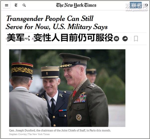 美军最高级别官员打脸特朗普:变性人仍可服役