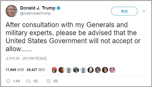 7月26日,特朗普连发三条推特,表示将禁止跨性别士兵服役 报道称,特朗普的声明令五角大楼的高级将领们十分惊讶(surprised),他们认为,奥巴马总统去年关于允许跨性别人员在军中公开服役的政策已经使事情在相当程度上得到了解决。 白宫新闻发言人桑德斯(Sarah Huckabee Sanders)27日拒绝回答关于如何处理目前正在服役的跨性别士兵的问题,仅表示这一禁令需要国防部执行。而五角大楼的发言人杰夫•戴维斯(Capt. Jeff Davis)则在发布会上把所有问题都推给了白宫。 尽管邓福德的表态在一定程度上安抚了跨性别士兵当前的焦虑,但他没能回答国防部未来将是否将再次禁止跨性别人公开服役的问题。