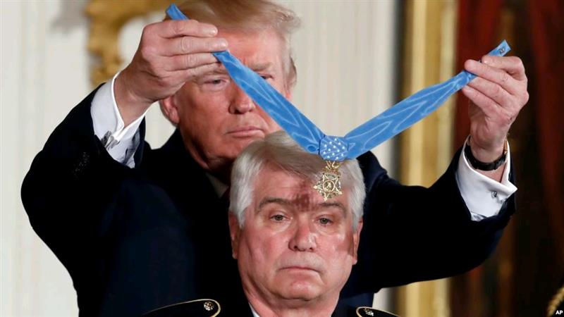 美国总统川普把代表美国军方最高荣誉的勋章授予前美国陆军军医吉姆·“大夫”·麦克劳恩(2017年7月31日) 五角大楼 — 美国总统川普为前美国陆军军医吉姆·“大夫”·麦克劳恩授予美国军方最高荣誉,以表彰他在1969年5月之溪山之战期间的英勇行为。 这位现年71岁的越战老兵是首位获川普总统授勋的军人,他因在三天的战斗中拯救了10名士兵的生命而受到表彰。 川普总统在白宫的授勋仪式上说,“今天,对于3亿2千万心存感恩的美国人的内心来说,列兵麦克劳恩被授予不朽的称号,这个称号就是‘英雄’”。 麦克劳恩多次受伤但是拒绝离开他的战友去接受治疗。 麦克劳恩对美国之音说,“我当时朝下看了看,我全身是血,我说,‘我不走。你们需要我’”。 之溪山之战 在将近50年前的那场恶战中, 196轻步旅21步兵团3营查理连的官兵从一开始就受到严峻考验。麦克劳恩和另外88名美军官兵对抗2千名越军。查理连死伤过半。 他的一名战友乔·米登多夫说,“老实说,我不知道他们为什么没有打死我们所有人。他们那么多人,到处都是”。 麦克劳恩在战斗中为米登多夫包扎伤口,米登多夫则多次掩护麦克劳恩冲上火线救回伤员。 米登多夫告诉美国之音说,“看着‘大夫’跑到火线,简直难以置信。你知道,不是很多人会那样做的。他做的事情是你在电影里才能看到的”。 战斗第一天,麦克劳恩冲上去救治的伤员之一是前中士比尔·阿诺德。阿诺德在直升机坠毁时被甩出机舱,膝盖严重受伤。 在遇到埋伏撤退时, 阿诺德意识到他跑不动了, 他用步枪当拐棍,拖着身子向前走,但是渐渐感到身体不支,眼前的地平线开始模糊了。 他抬起头,看见一个人向他跑过来。 他说,他有点糊涂了。 阿诺德说,“什么人会往火线上冲呢?”阿诺德回忆起那个给人以希望的时刻,他的眼睛亮了起来:“是卫生兵,他来救我了。“ 第二天,越南人开始对专业下士肯特·尼尔森的阵地形成包围,他的肩膀后面中弹。子弹穿过胸膛。 尼尔森倒在地上,他的武器落在身上。麦克劳恩跑过去,为他包扎伤口,把他背到安全地点,在战斗还在进行的时候,守护了他整整一夜。 尼尔森说, “他的确给了我第二次生命。“ 万念俱灰 第三天,天还没亮, 查理连既没有食物也没有水。前中士迈克·马提诺说,情况不妙, 大家期待的援救直升机飞走了。 他对美国之音说,所有的希望都随着直升机消失了。几乎没人讲话,然后有人小声地说, “给自己留下一颗子弹。“ 麦克劳恩记得他在可怕的战斗中停下来祈祷。 麦克劳恩说, “我说:上帝,如果你让我摆脱这个人间地狱,让我能亲自对我的父亲说我爱他,给他一个拥抱,我一定成为我所能够成为的最好的父亲,最好的教练和最好的老师。“ 麦克劳恩说,他履行了自己的诺言。他有两个儿子,培养训练了133个高中球队, 20个小联盟棒球队和13个初级摔跤队。他说,他的体育背景给了他好的体力,让他能够精力集中地在严酷的战斗中存活下来。 现在他被授予美国的最高军事荣誉。他的战友们说,他们知道他们的”医生“会实至名归。 马提诺说, “他会再接再厉,帮助更多的人。”
