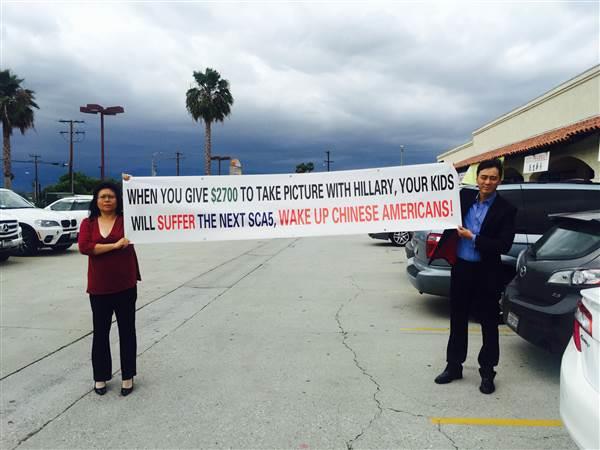 Wang, left, displaying one of Chinese Americans for Trump's signs. Courtesy of Tian Wang