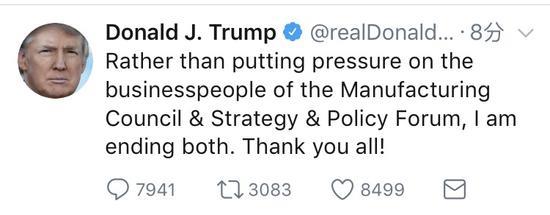 特朗普在推文中写道:“与其给制造业顾问委员会和战略与政策论坛的商人们施加压力,我倒不如将它们都关闭,谢谢你们所有人!” 据海外网此前报道,当地时间15日,美国总统特朗普在推特上表示,并不在乎美企CEO的行为,并称有的是人替他们。 特朗普在推文中说:“每个退出制造业顾问委员会的CEO,我有的是人来代替他们。哗众取宠的人早就应该别再搞事情了。” 特朗普上台之后,邀请重量级企业家组成制造业委员会(Manufacturing Council),与主管劳工事务的白宫官员合作,促进全美就业机会。 白人至上主义团体在弗吉尼亚州举行集会,演变成一场暴力冲突,但事后特朗普并未明确进行谴责,因而遭到各方批评。 最知名的非洲裔企业人士之一、默克制药公司(Merck)首席执行官弗瑞兹尔(Kenneth Frazier )14日宣布退出特朗普的制造业委员会。 此外,运动品牌安德玛CEO凯文·普兰克(Kevin Plank)已经宣布退出特朗普制造业委员会和芯片制造商英特尔公司CEO科再奇(Brian Krzanich)也向美国制造业委员会递交辞呈。 当地时间8月14日,特朗普公开谴责白人至上主义者,称“种族主义是罪恶的”。 “那些导致暴力的人是罪犯和恶棍,包括三K党、新纳粹党和白人至上主义者,以及其他仇恨团体,对于我们所珍视的美国人来说,一切都是令人厌恶的。”特朗普说。