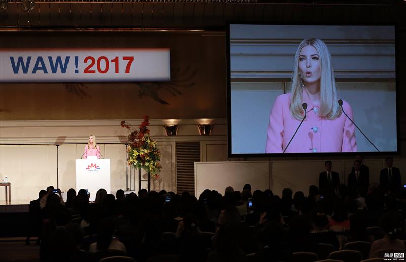 美国“第一千金”伊万卡·特朗普与日本首相安倍晋三 美国总统特朗普的女儿、白宫顾问伊万卡,11月3日上午在东京出席了由日本政府主办的“国际女性会议”(WAW!2017),并就女性如何参与经济领域的活动发表了讲演。 日本首相安倍晋三在“国际女性会议”致辞中说:“日本决心在世界上继续高举‘女性活跃’大旗,并为此发挥强大的领导能力。”安倍还宣布,将向伊万卡主导设立的女性企业家支援基金援助5000万美元(约合57亿日元)。女性企业家支援基金是今年由伊万卡提议、世界银行设立的。 为实现“让女性在社会中闪耀”这一目标,日本政府从2014年起每年举办“国际女性会议WAW”,邀请世界各国不同行业的女性领导者出席,讨论女性政策等问题。今年的会议于11月1日至3日在东京举办。作为拥有自己时装品牌的实业家,伊万卡表示,“占人口半数的女性在社会中的活跃对促进经济增长非常必要。”