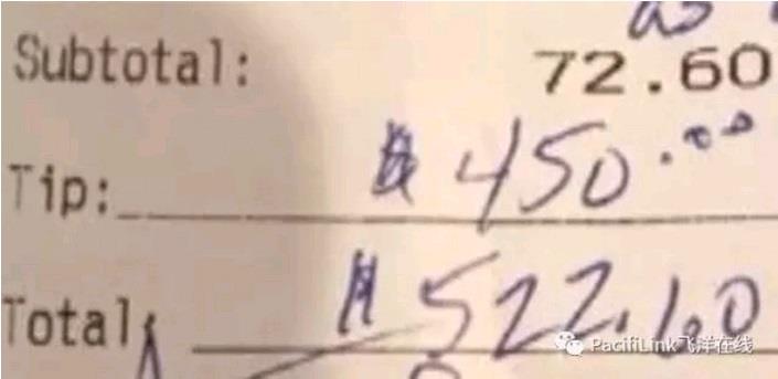 但是。。。当她拿到账单时,她几乎不敢相信自己的眼睛:杰森·怀特(Jason White)付了450美元小费,而整个消费才只有72.60美元。