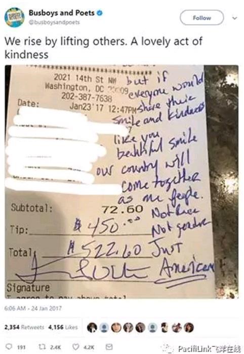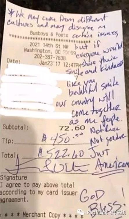 然后罗莎琳看到了账单上写的字: “我们可能有不同的文化,在某些问题上可能有分歧,但如果我们每个人都能像你这样分享美丽的微笑和善意,我们国家就不会分裂,会是一个不分种族,不分性别,一个美国人的国家。愿上帝保佑!“ 杰森的这份无私馈赠,让罗莎琳感动,但她不明白为什么。