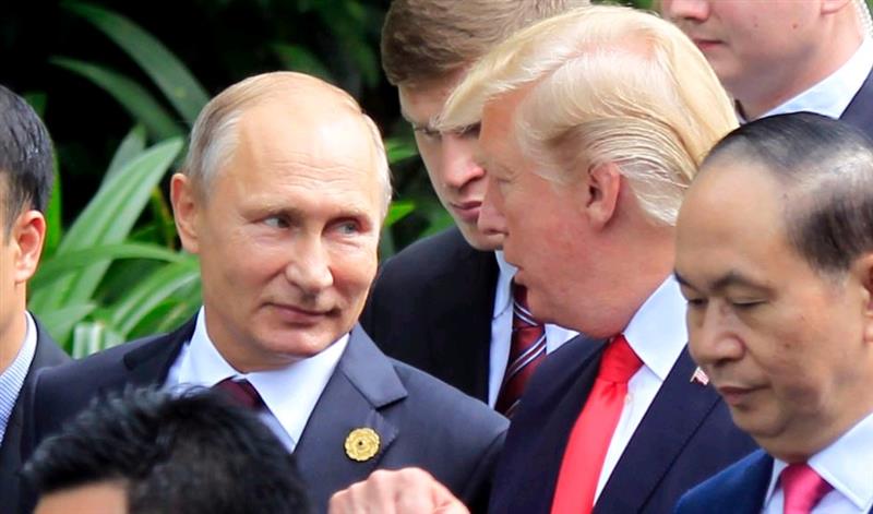 FILE - Russian President Vladimir Putin, left, and U.S. President Donald Trump talk as they arrive for the family photo session during the Asia-Pacific Economic Cooperation summit in Danang, Vietnam, Nov. 11, 2017. U.S. President Donald Trump and Russian President Vladimir Putin agreed Tuesday to support the U.N. effort to "peacefully resolve" the nearly seven-year-long Syrian civil war. The White House said the two leaders talked for more than an hour and stressed the importance of ending the humanitarian crisis in which millions of Syrians have been displaced from their homes. Trump and Putin said the displaced Syrians should be allowed to return and "the stability of a unified Syria free of malign intervention and terrorist safe havens" should be ensured. Trump talked by phone with Putin a day after the Russian leader held discussions in Russia with Syrian leader Bashar al-Assad about a political resolution to the civil war, which has killed 400,000 people. The White House said Trump and Putin "affirmed the importance of fighting terrorism together throughout the Middle East and Central Asia and agreed to explore ways to further cooperate in the fight against ISIS, al-Qaida, the Taliban and other terrorist organizations." In addition, they discussed ways "to implement a lasting peace in Ukraine," where pro-Russian separatists have been fighting troops loyal to Kyiv, and how to keep international pressure on North Korea to end its nuclear weapon and missile development programs. The Kremlin said Tuesday that it had called Assad to the Black Sea resort of Sochi for talks with Putin about Russia's peace proposals for Syria, ahead of Putin's summit Wednesday with Turkish President Recep Tayyip Erdogan and Iranian President Hassan Rouhani.