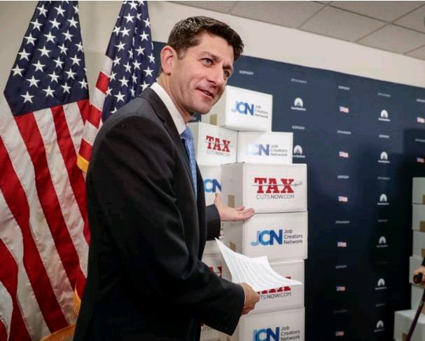 FILE - House Speaker Paul Ryan, R-Wis., points to boxes of petitions supporting the Republican tax reform bill as he arrives for a news conference on Capitol Hill in Washington, Nov. 14, 2017.