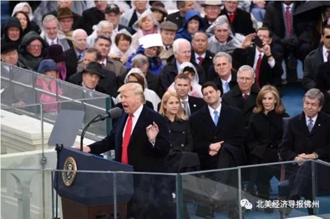 资料图片:1月20日,在美国首都华盛顿国会山,特朗普(前)在美国第45任总统就职典礼上发表讲话。新华社记者 殷博古 摄