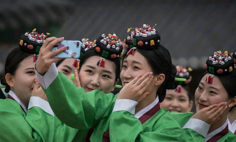韩国首尔的学生在成人仪式中自拍。益普索公司的民调显示,韩国民众中认为会发生战争的比例只有21%。