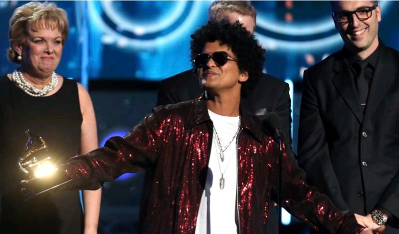 “火星哥”布鲁诺·马尔斯在格莱美颁奖典礼上接受最佳年度制作奖。(2018年1月28日)