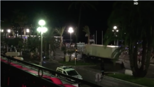 Taggeschau.de An image from a video shows the large truck as it plows through a crowd a people in Nice, France. “There was carnage on the road,” Nice resident Wassim Bouhlel told the AP. “Bodies everywhere.” A reporter from Agence France-Presse saw a white truck driving at high speed, hitting pedestrians and sending debris into the air. Crowds had gathered along the promenade to watch a fireworks display for the French holiday. Images posted on social media showed people running through the streets of the southern French city. Local newspaper Nice-Matin posted images of a white truck at the scene and said the vehicle was riddled with bullets.