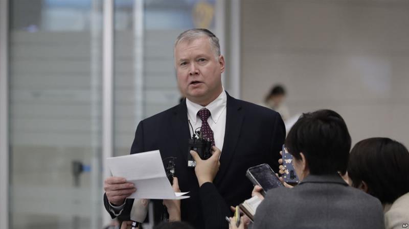 美国朝鲜问题特使比根2018年12月19日抵达仁川机场时向媒体宣读声明(美联社)