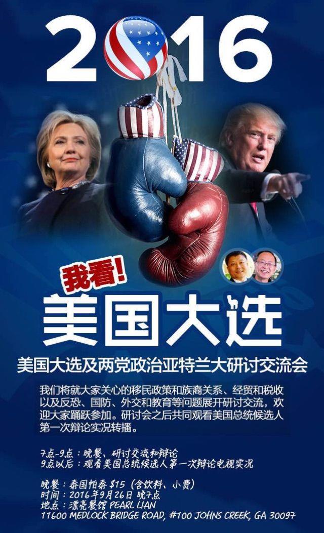 谁说老中只讲吃,谁说政治只是茶余饭后的笑谈?2016年9月26日晚7点整,在即将开始的美国总统大选首场辩论前两个钟头,亚特兰大的一群老中聚集在Johns Creek的漂亮餐馆(Pearl Lian),不是为了来吃,而是为了来侃。 他们自己先摆开擂台,掐时间,立规矩,由民主党,共和党,中间派各3-4位代表,拉开了一场火药味十足的模拟辩论。在新奇创意的热闹中“玩”了一把政治。