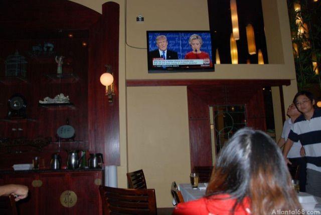 先说这里有一个漂亮餐馆,方老板是一个成功的华人业主,更是一年前鼓动Jay Lin 作为第一位华人出来竞选johns Creek市议员的始作俑者。漂亮餐馆由此成为竞选团队的大本营,无偿地为竞选团队每周例会提供了场地和粮草。今天他又为这场模拟的总统辩论提供了战场,先吃后战,边吃边观战。